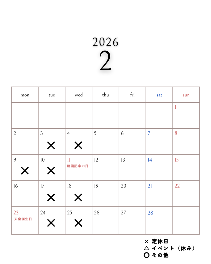 当店は基本以下の曜日におやすみをいただいております。火曜日/水曜日出張修理・イベント・ツアー等の理由によりスタッフ不在の時間帯がございます。2月9日(月)は、「建国記念の日(2/11)」の振替休日をいただきます。※営業予定は変更となる場合がございます。